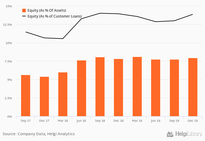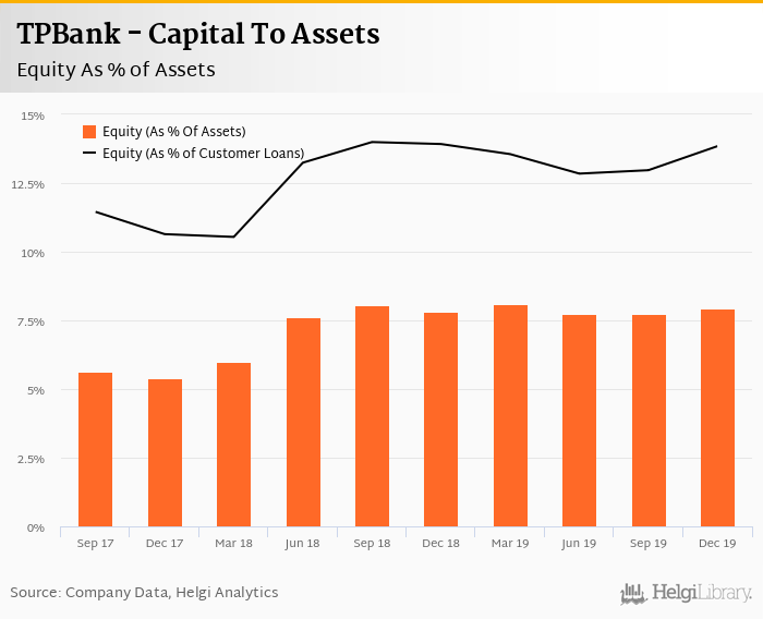 TPBank's Equity reached 7.94% of total assets in the 4Q2019, up from 7.80% for the previous year. As a share of net customer loans, the ratio amounted to 13.8% at the end of the fourth quarter of 2019.