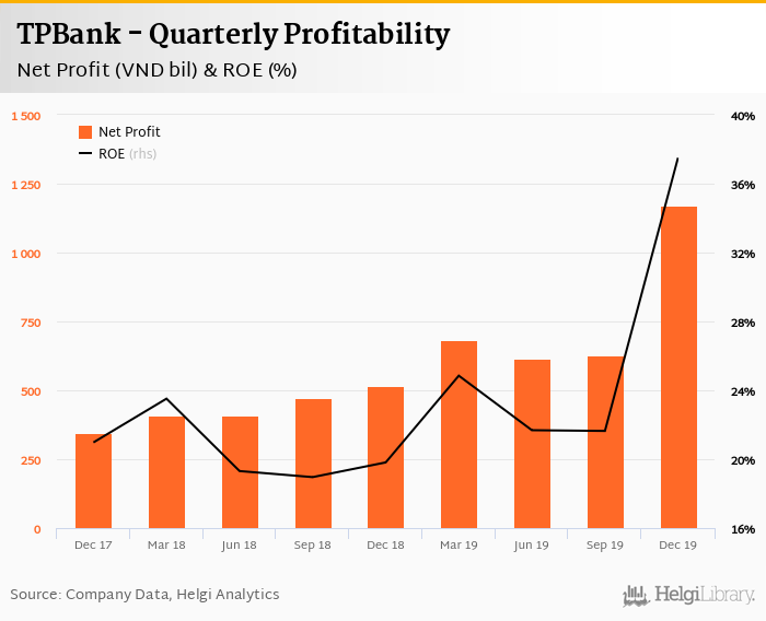 TPBank made a net profit of VND 1,171 bil in the fourth quarter of 2019, up 127% when compared to the same period of last year. This implies a return on equity of 37.5%.