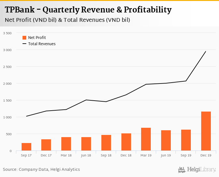 TPBank made a net profit of VND 1,171 bil under revenues of VND 2,951 bil in the fourth quarter of 2019, up 127% and 78.4% respectively when compared to the same period last year.