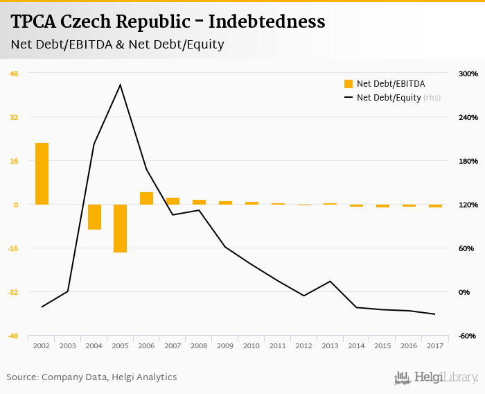 TPCA Czech Republic's net debt stood at CZK -1,842 mil and accounted for -31.4% of equity at the end of 2017. The ratio is down 4.68 pp compared to the previous year.