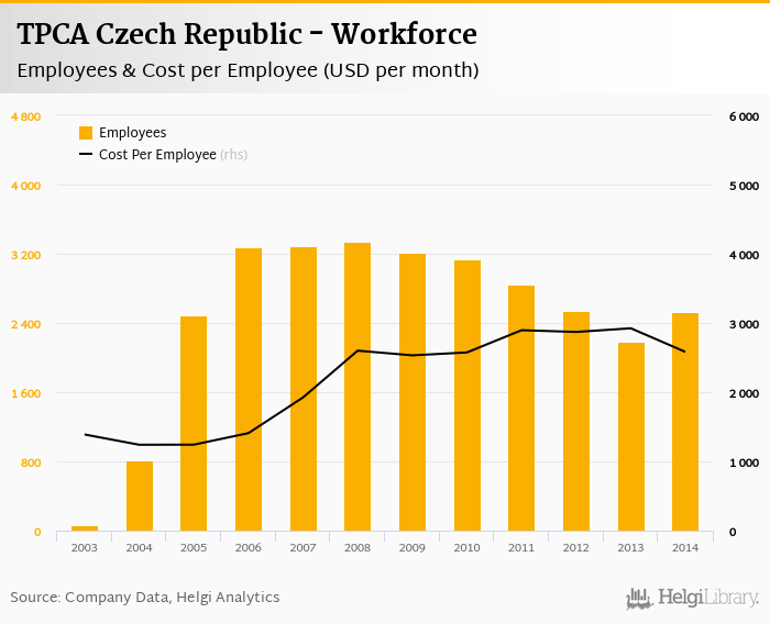TPCA Czech Republic employed 2,528 employees in 2014, up 15.5% compared to the previous year. Historically, between 2003 and 2014, the firm's workforce hit a high of 3,336 employees in 2008 and a low of 68.0 employees in 2003.