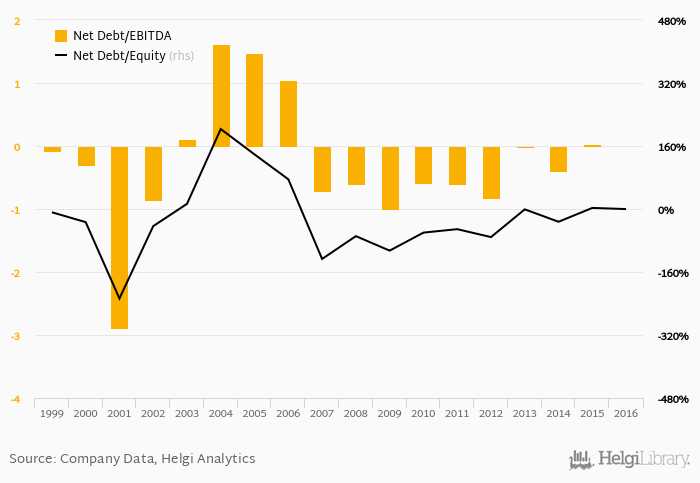 Historically, the firm’s net debt to equity reached a high of 203% in 2004 and a low of -227% in 2001 between 1999 and 2016. The average for the last five years was -20.4%.