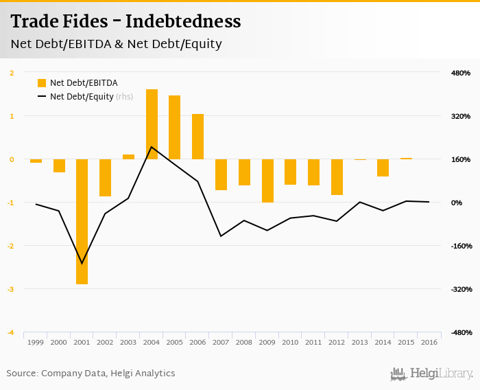 Trade Fides's net debt stood at CZK -0.620 mil and accounted for -0.227% of equity at the end of 2016. The ratio is down 2.94 pp compared to the previous year.