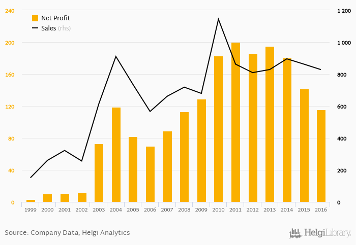 Sales have grown by 3.87% a year on average since 2006. They reached a high of CZK 1,143 mil in 2010 and a low of CZK 151 mil in 1999.