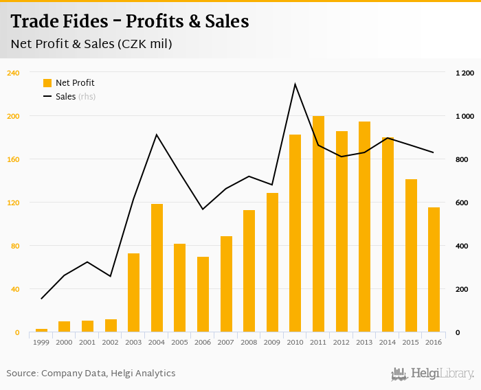 Trade Fides made a net profit of CZK 115 mil in 2016, down 18.4% compared to the previous year. Total sales reached CZK 828 mil, which is down 3.98% when compared to the previous year.
