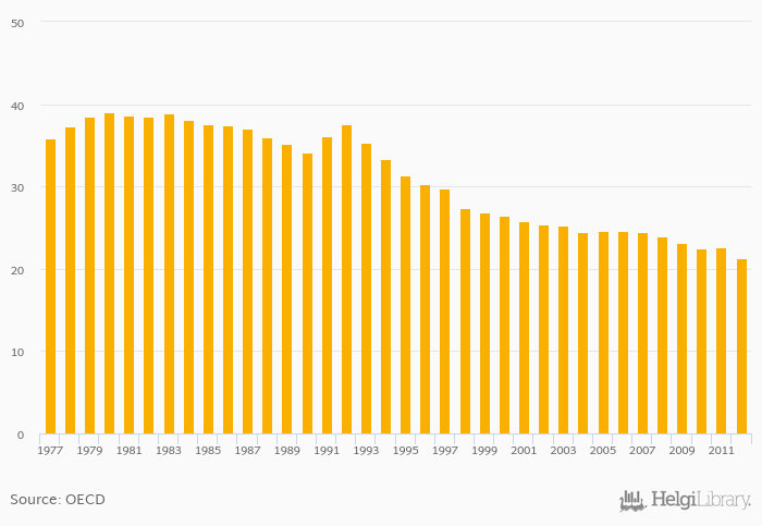 Historically, Trade Union Density in Greece reached an all time high of 39.0% in 1980 and an all time low of 21.3% in 2012.