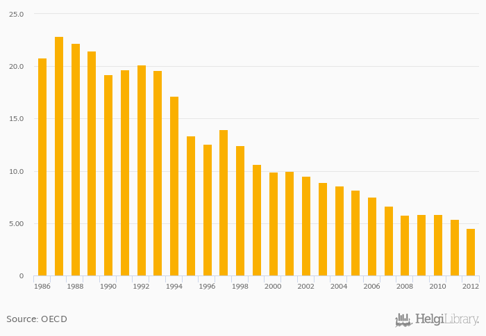 Historically, Trade Union Density in Turkey reached an all time high of 22.9% in 1987 and an all time low of 4.54% in 2012.
