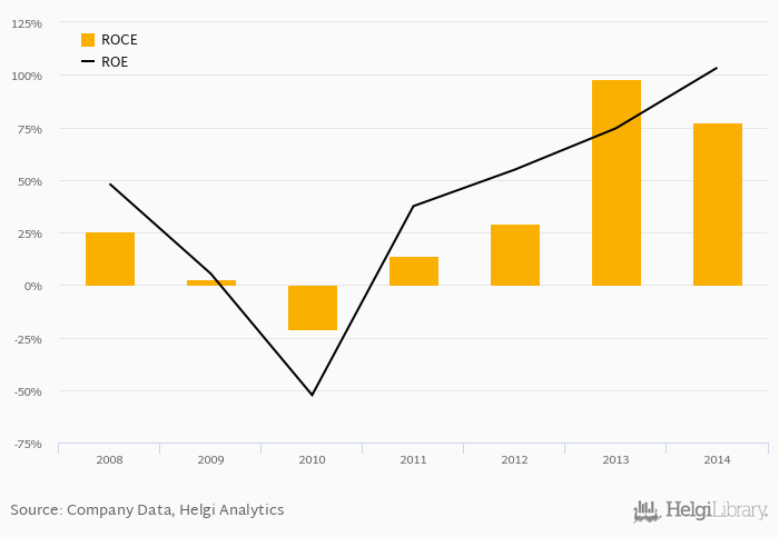 The result implies a return on equity of 103% and a return on invested capital of 77.3% in 2014. That is compared to an average of 43.6% and 39.5% over the last five years.