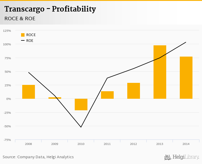 As far as Transcargo's peers are concerned, Bohemia Cargo generated ROE of 6.67% and ROCE of 3.10% in 2014. CS Cargo's profitability reached -17.9% and -2.01%, respectively. CD Cargo operated with 7.97% and 4.70% returns in 2014.