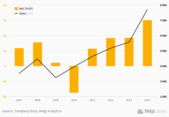 Sales have grown by 18.9% a year on average since 2009. They reached a high of CZK 7,689 mil in 2014 and a low of CZK 3,232 mil in 2009.