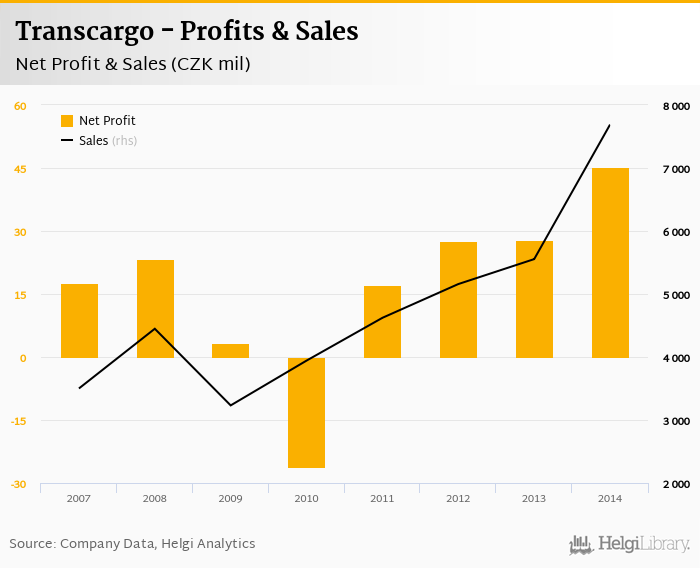 Transcargo made a net profit of CZK 45.2 mil in 2014, up 62.8% compared to the previous year. Total sales reached CZK 7,689 mil, which is up 38.4% when compared to the previous year.