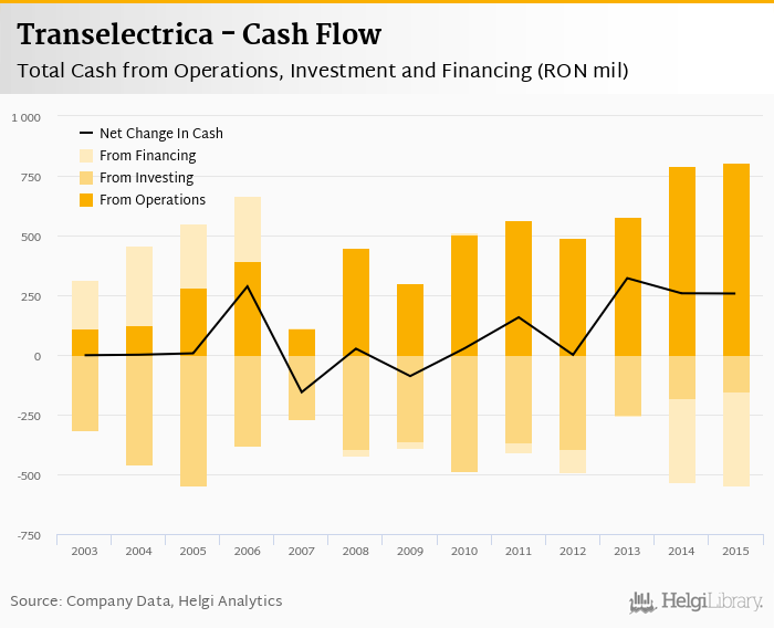 Cash from financing amounted to RON -395 mil, so the company generated RON 257 mil net cash in 2015.