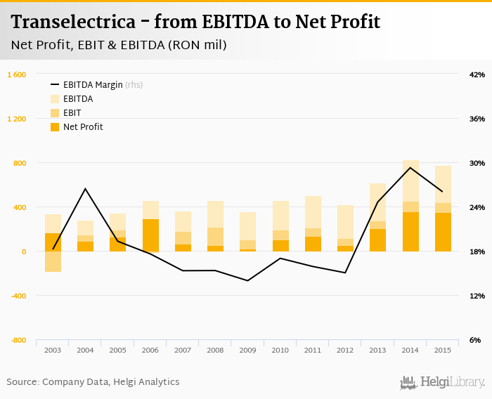 Transelectrica made a net profit of RON 348 mil with revenues of RON 2,986 mil in 2015, down by 1.42% and up by 5.77%, respectively, compared to the previous year. This translates into a net margin of 11.7%.