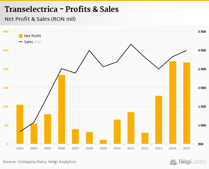Transelectrica made a net profit of RON 348 mil in 2015, down 1.42% compared to the previous year. Total sales reached RON 2,986 mil, which is up 5.77% when compared to the previous year.