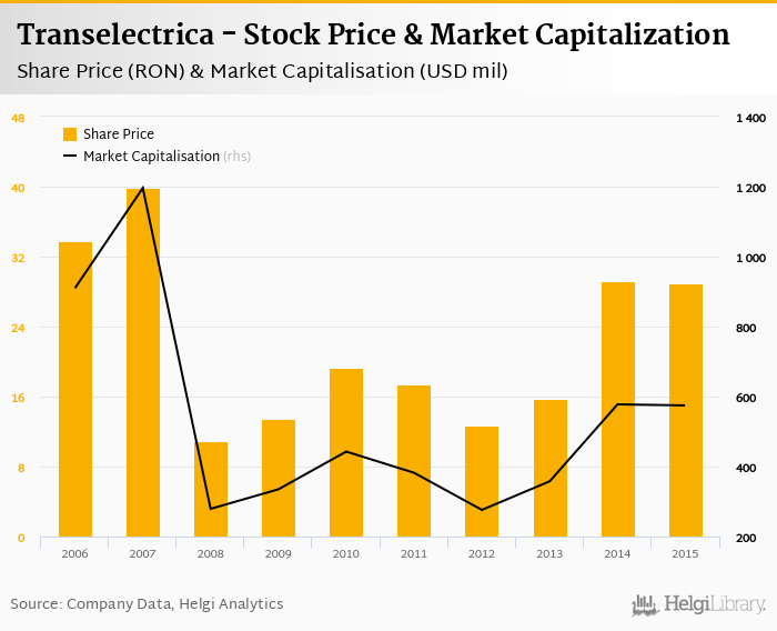 Transelectrica stock traded at RON 29.0 per share at the end 2015 implying a market capitalization of USD 575 mil.