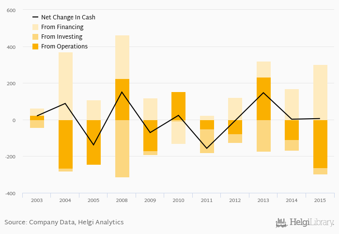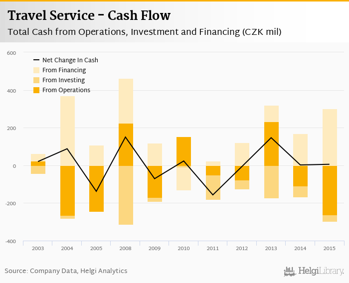 Cash from financing amounted to CZK 302 mil, so the company generated CZK 5.57 mil net cash in 2015.