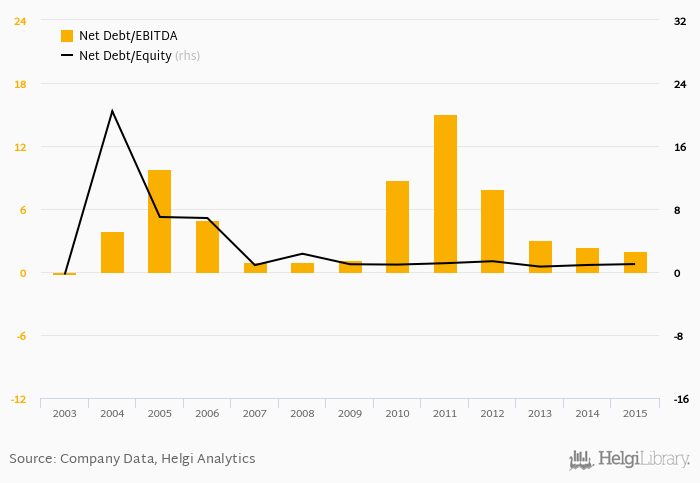 Historically, the firm’s net debt to equity reached a high of 20.4 in 2004 and a low of -0.318 in 2003 between 2003 and 2015. The average for the last five years was 1.01%.