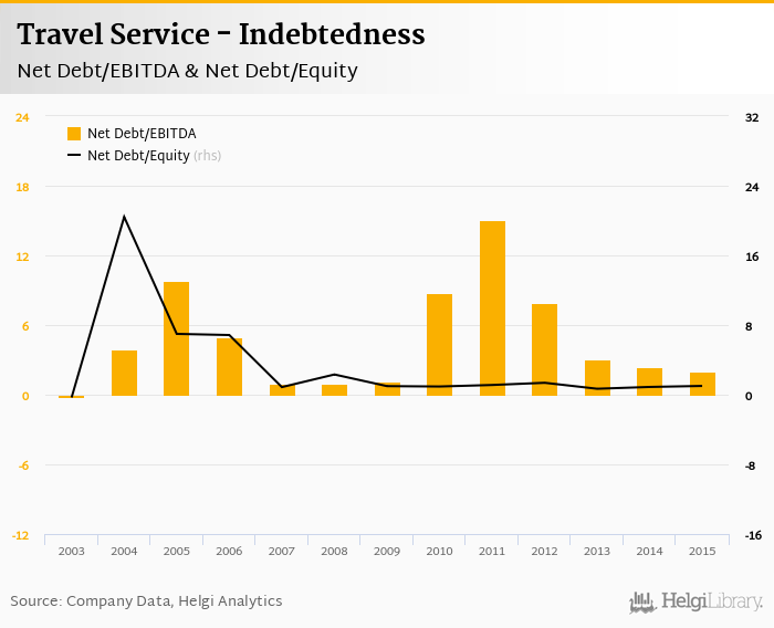 Travel Service's net debt stood at CZK 990 mil and accounted for 1.01 of equity at the end of 2015. The ratio is up 0.115 pp compared to the previous year.