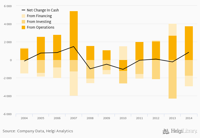 Cash from financing amounted to CZK -1,189 mil, so the company generated CZK 836 mil net cash in 2014.