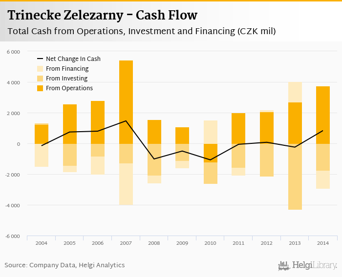 Trinecke Zelezarny's operating cash flow stood at CZK 3,758 mil in 2014, up 39.2% when compared to the previous year. Historically, between 2004 - 2014, the firm’s operating cash flow reached a high of CZK 5,442 mil in 2007 and a low of CZK -1,216 mil in 2010.