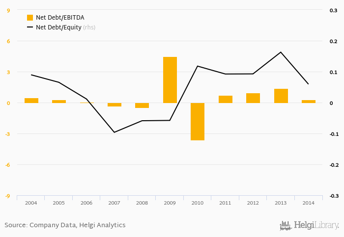 Historically, the firm’s net debt to equity reached a high of 0.163 in 2013 and a low of -0.096 in 2007 between 2004 and 2014. The average for the last five years was 0.105%.