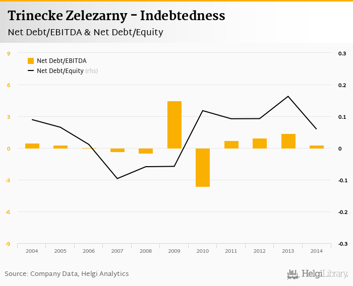 Trinecke Zelezarny's net debt stood at CZK 1,454 mil and accounted for 0.059 of equity at the end of 2014. The ratio is down 0.104 pp compared to the previous year.