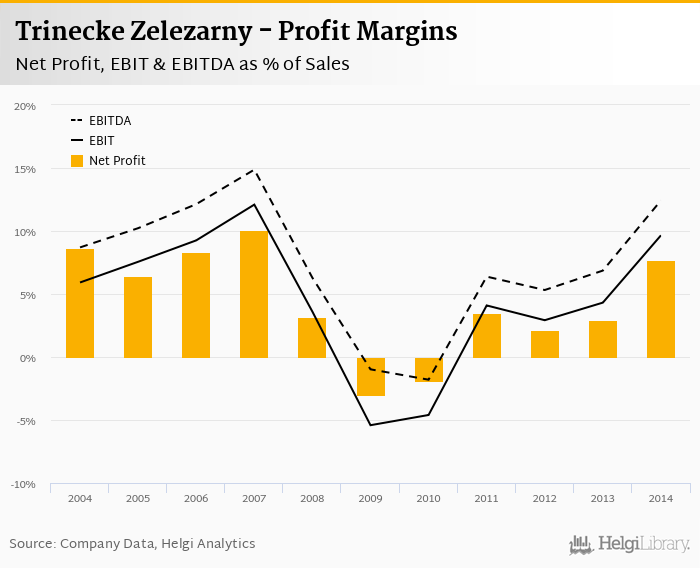 Trinecke Zelezarny made a net profit of CZK 3,048 mil with revenues of CZK 39,584 mil in 2014, up by 182% and up by 6.67%, respectively, compared to the previous year.