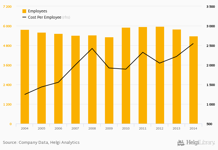 Staff cost represented of sales in 2014, 0 pp higher than a decade ago.