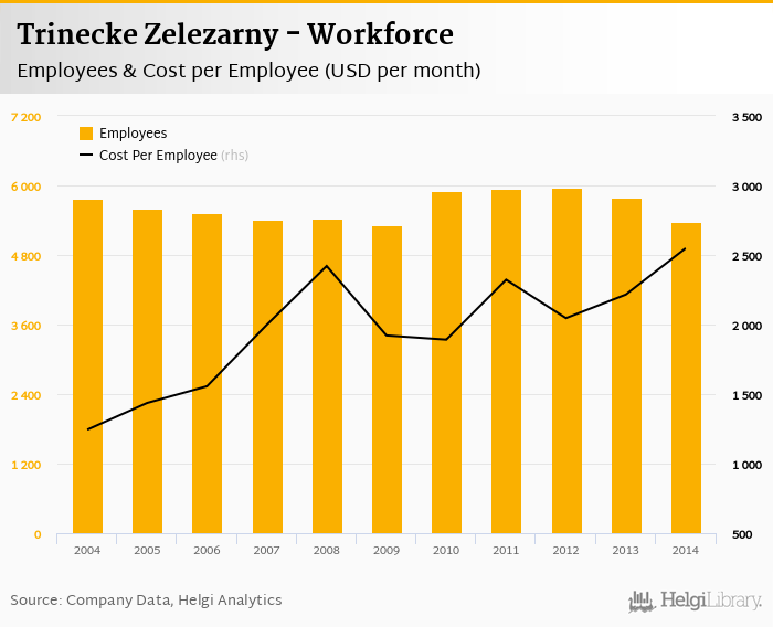 Trinecke Zelezarny employed 5,375 employees in 2014, down 7.33% compared to the previous year. Historically, between 2003 and 2014, the firm's workforce hit a high of 6,263 employees in 2003 and a low of 5,319 employees in 2009.