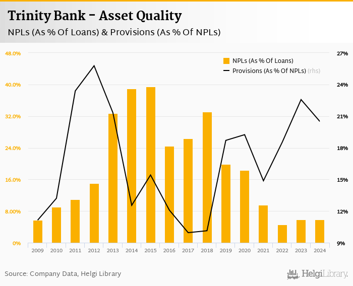 Trinity Bank's non-performing loans reached 5.87% of total loans at the end of 2024, up from 5.82% compared to the previous year. Historically, the NPL ratio hit an all time high of 39.4% in 2015 and an all time low of 4.63% in 2022.