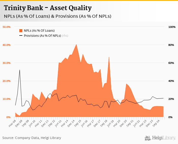 Trinity Bank's non-performing loans reached 5.68% of total loans at the end of 2025-03-31, down from 5.83% compared to the previous year. Historically, the NPL ratio hit an all time high of 40.2% in 2015-03-31 and an all time low of 0.525% in 2008-09-30.