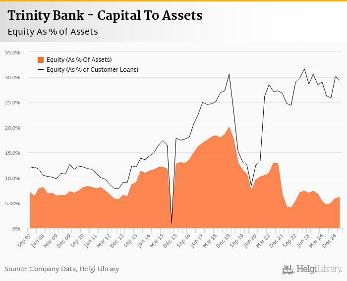 Trinity Bank's Equity reached 6.04% of total assets in the 1Q2025, up from 5.28% for the previous year. As a share of net customer loans, the ratio amounted to 29.4% at the end of the first quarter of 2025.