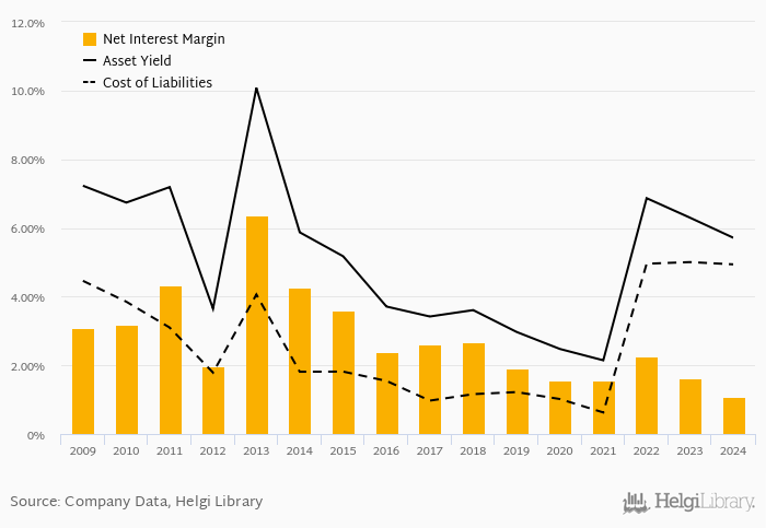 Historically, the bank’s net interest margin reached an all time high of 6.37% in 2013 and an all time low of 1.08% in 2024. The average margin in the last five years amounted to 1.62%.