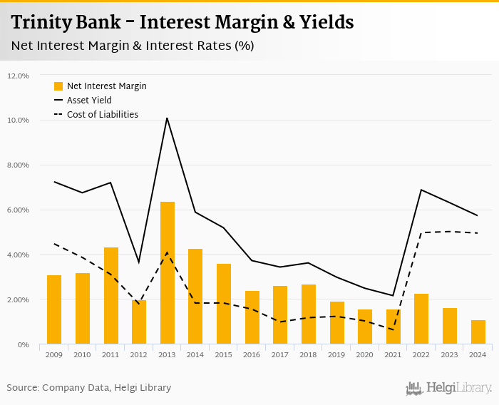 Trinity Bank's net interest margin amounted to 1.08% in 2024, down from 1.64% compared to the previous year.