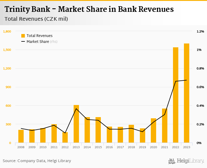 Trinity Bank generated total banking revenues of CZK 1,606 mil in 2023, up 4.11% compared to the previous year.