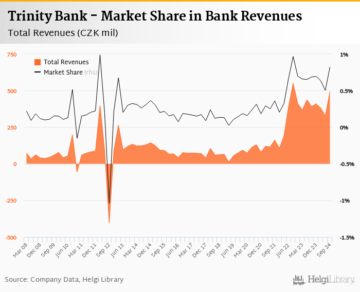 Trinity Bank generated total banking revenues of CZK 494 mil in 2024-09-30, up 51.3% compared to the previous year.