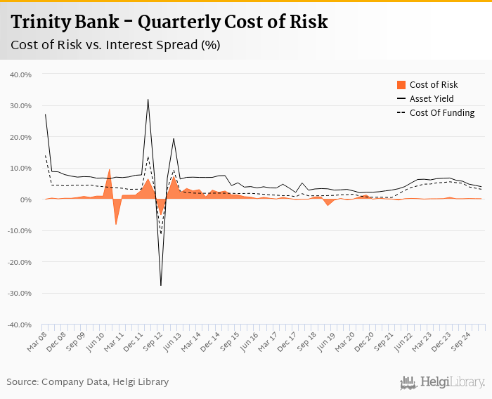 Trinity Bank's Cost of Risk (loan loss provisions as % of total assets) amounted to 0.026% in the first quarter of 2025, down from 0.041% when compared to the previous quarter.