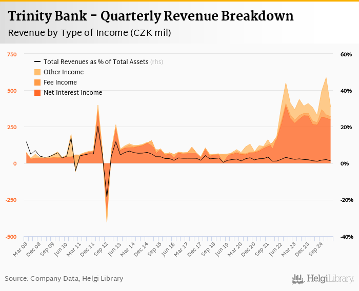 Trinity Bank generated total banking revenues of CZK 386 mil in the first quarter of 2025, up 1.2% when compared to the same period of last year and down 34.2% when compared to the previous quarter.