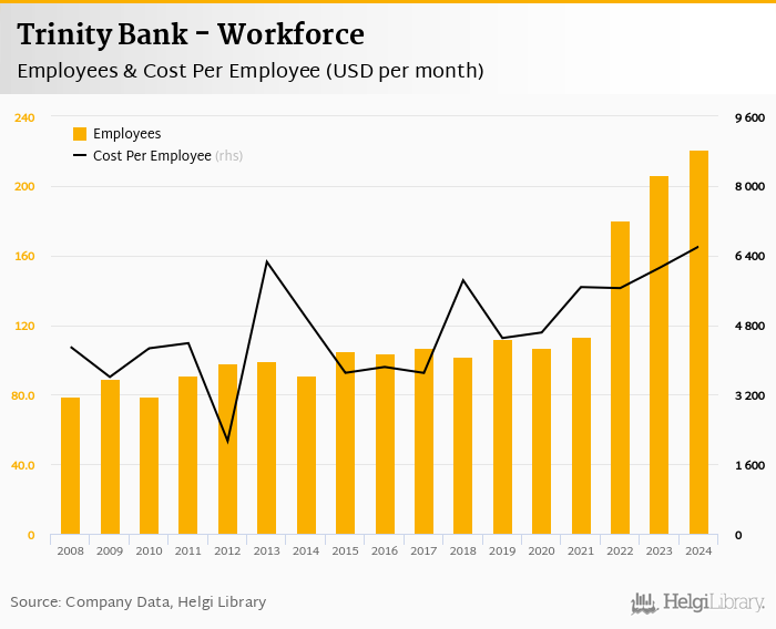 Trinity Bank employed 221 persons in 2024, up 7.28% when compared to the previous year. Historically, the bank's workforce hit an all time high of 221 persons in 2024 and an all time low of 79.0 in 2008.