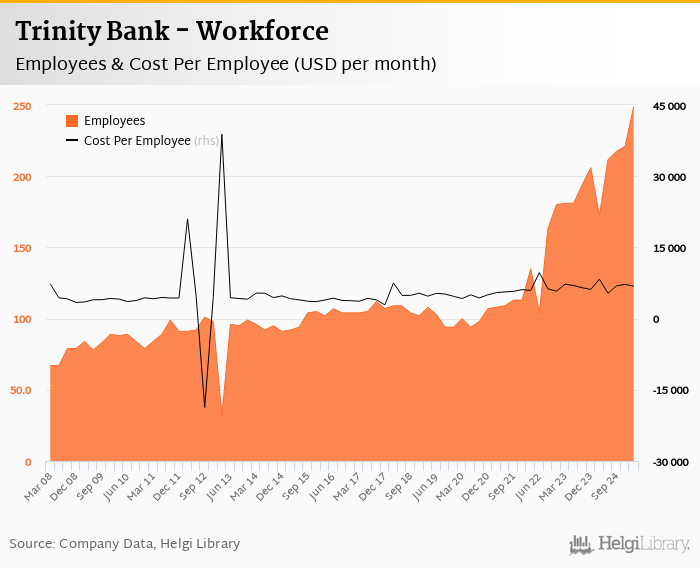 Trinity Bank employed 249 persons in 2025-03-31, up 12.7% when compared to the previous year. Historically, the bank's workforce hit an all time high of 249 persons in 2025-03-31 and an all time low of 32.0 in 2013-03-31.