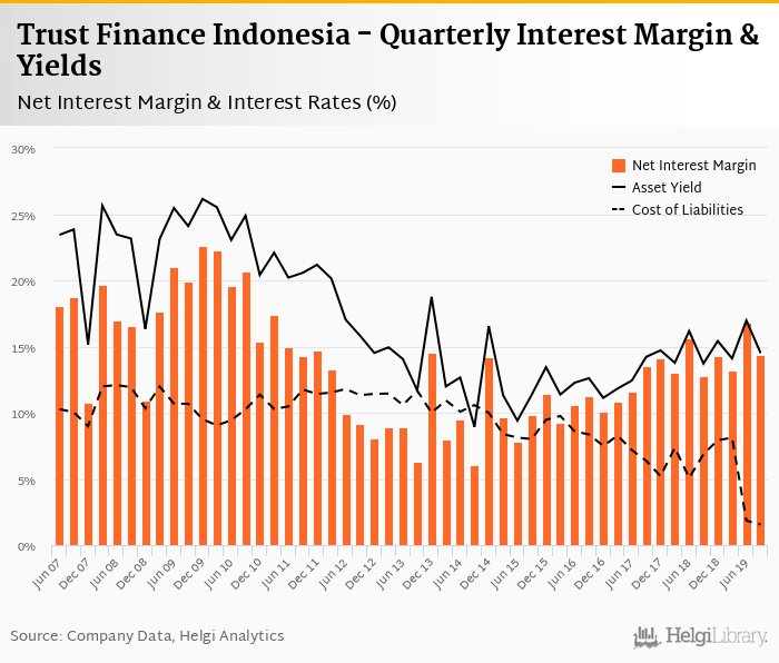 Trust Finance Indonesia's net interest margin amounted to 14.4% in the third quarter of 2019, down from 16.8% when compared to the previous quarter.