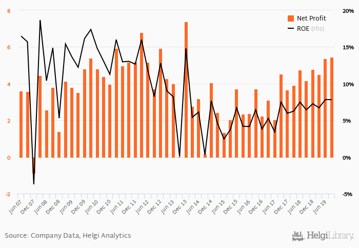 The bank generated its shareholders an average return on equity of 5.77% in the last five years with maximum at 7.83% and minimum at 2.45%.