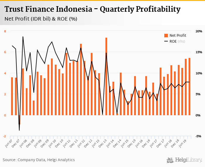Trust Finance Indonesia made a net profit of IDR 5.45 bil in the third quarter of 2019, up 30.9% when compared to the same period of last year. This implies a return on equity of 7.81%.