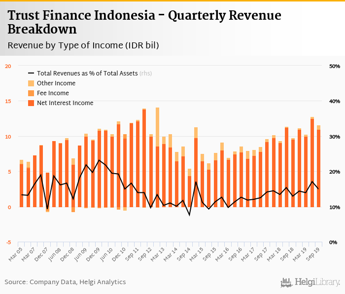 Trust Finance Indonesia generated total banking revenues of IDR 11.6 bil in the third quarter of 2019, up 18.5% when compared to the same period of last year and down 9.72% when compared to the previous quarter.