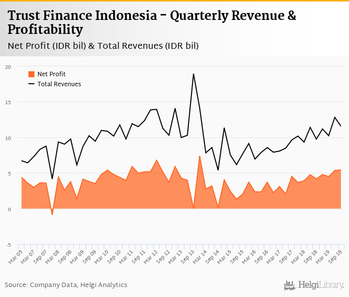 Trust Finance Indonesia made a net profit of IDR 5.45 bil under revenues of IDR 11.6 bil in the third quarter of 2019, up 30.9% and 18.5% respectively when compared to the same period last year.