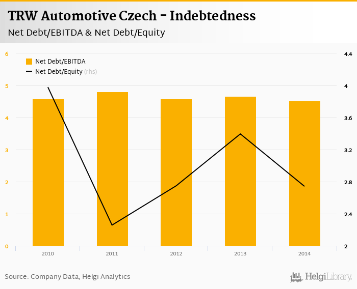 TRW Automotive Czech's net debt stood at CZK 7,872 mil and accounted for 2.74 of equity at the end of 2014. The ratio is down 0.654 pp compared to the previous year.