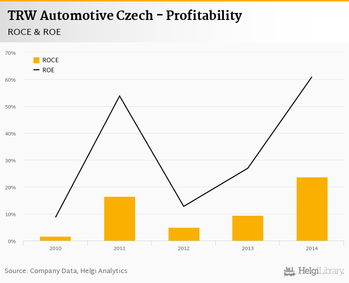 As far as TRW Automotive Czech's peers are concerned, Varroc Lighting Systems Czech Republic generated ROE of 39.2% and ROCE of 30.7% in 2014. Automotive Lighting's profitability reached 43.1% and 35.9%, respectively. Continental Automotive Czech Republic operated with 17.7% and 4.79% returns in 2014.
