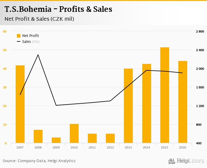 T.S.Bohemia made a net profit of CZK 44.1 mil in 2016, down 14.2% compared to the previous year. Total sales reached CZK 1,902 mil, which is down 1.88% when compared to the previous year.