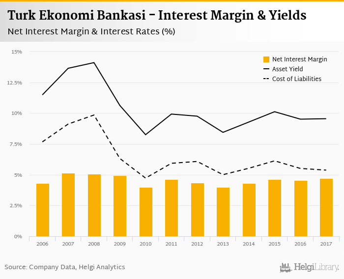 Turk Ekonomi Bankasi's net interest margin amounted to 4.72% in 2017, up from 4.55% compared to the previous year.