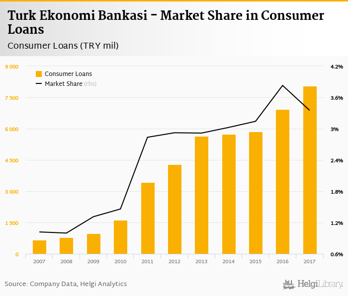 Turk Ekonomi Bankasi's consumer loans reached TRY 8,054 mil in 2017, up 16.2% compared to the previous year.